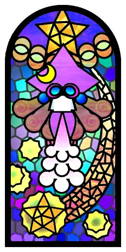 The strangely-drawn depiction of her seen in this window seems to suggest that, during her life, Merlimbis looked identical to Merluvlee the fortune teller. Indeed, both Tippi and Tiptron state that Merluvlee is a direct descendant of Merlimbis, as is the similar-looking Merlee.