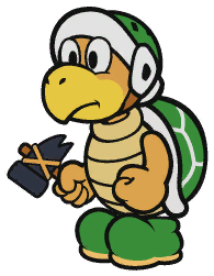 Hammer Bros. are species of a Koopa Troopa. In the first three Paper Mario games, their helmets are blue. Their shells are green like their appearance in other Mario games, whereas Fire Bros. and Boomerang Bros have red and black shells, respectively. In battle, they will attack by throwing their hammers, like in most of their other appearances; these can shrink Mario if not guarded against. As Goombario states, they throw many hammers at once if they are desperate.