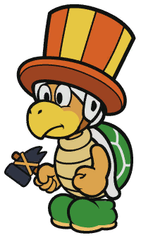 Juggler Bros are a form of Hammer Bros that appear in Paper Mario: Color Splash as enemies. Their most distinct feature is their large orange and yellow striped top hats that they wear, as well as their ability to juggle multiple hammers effortlessly. Despite this, they have identical stats to normal Hammer Bros. Juggler Bros all appear to be members of The Emerald Circus. Several of them are also part of a group called the Pentabros. Though Juggler Bros frequently are seen as only enemies, one unnamed Bro behind the Emerald Circus tent will give Mario a hint to defeating Lemmy, telling him that his ball could be popped by sharp objects(implying that a certain Thing card must be used).