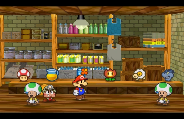 The Toad Bros. Bazaar is a shop located in the central plaza of Rogueport. This shop is run by Thriff T. and Plenn T.