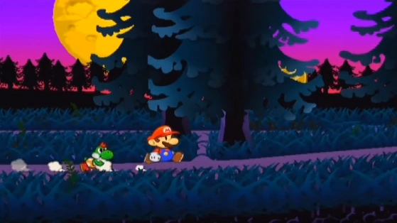 Twilight Trail is a large, eerie, spooky trail that connects Twilight Town to Creepy Steeple. It is found and used during the events of Paper Mario: The Thousand-Year Door. The Twilight Trail is a dark area full of bare, dead trees and dark green grass; the ground on which Mario must travel is purple in color. During Chapter 4 of the game, Mario must travel back and forth throughout these woods many times in order to find "The Letter 'P'" to guess Doopliss' name, and defeat him. In order to gain access to the Twilight Trail, Mario must enter a pipe (which Flurrie must unveil, using her unique ability) and head towards the dark forest. Flurrie must also blow away certain parts of the woods to enable Mario to continue forth. In these woods, many enemies can be found. It is also hard to avoid contact with these enemies, as the paths in which they travel are considerably narrow. Towards the end of the forest, a large rock must be pushed in the background by Mario in order for its larger version in the path to move.
